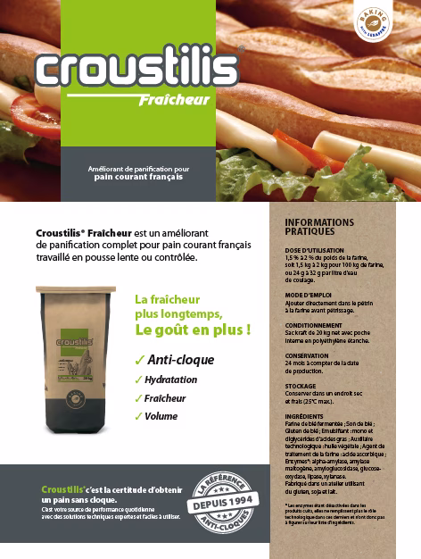 Croustilis Fraîcheur est l’améliorant de choix pour le pain courant français, conçu pour les pâtes en pousse lente ou contrôlée, garantissant fraîcheur et qualité optimales.